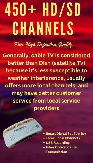 RRS Smart WiFi Enjoy Your Home Entertainment with 450+ HD/SD Digital Channels. Smart Set top box with USB recording to playback. Local Tamil Channels also available.